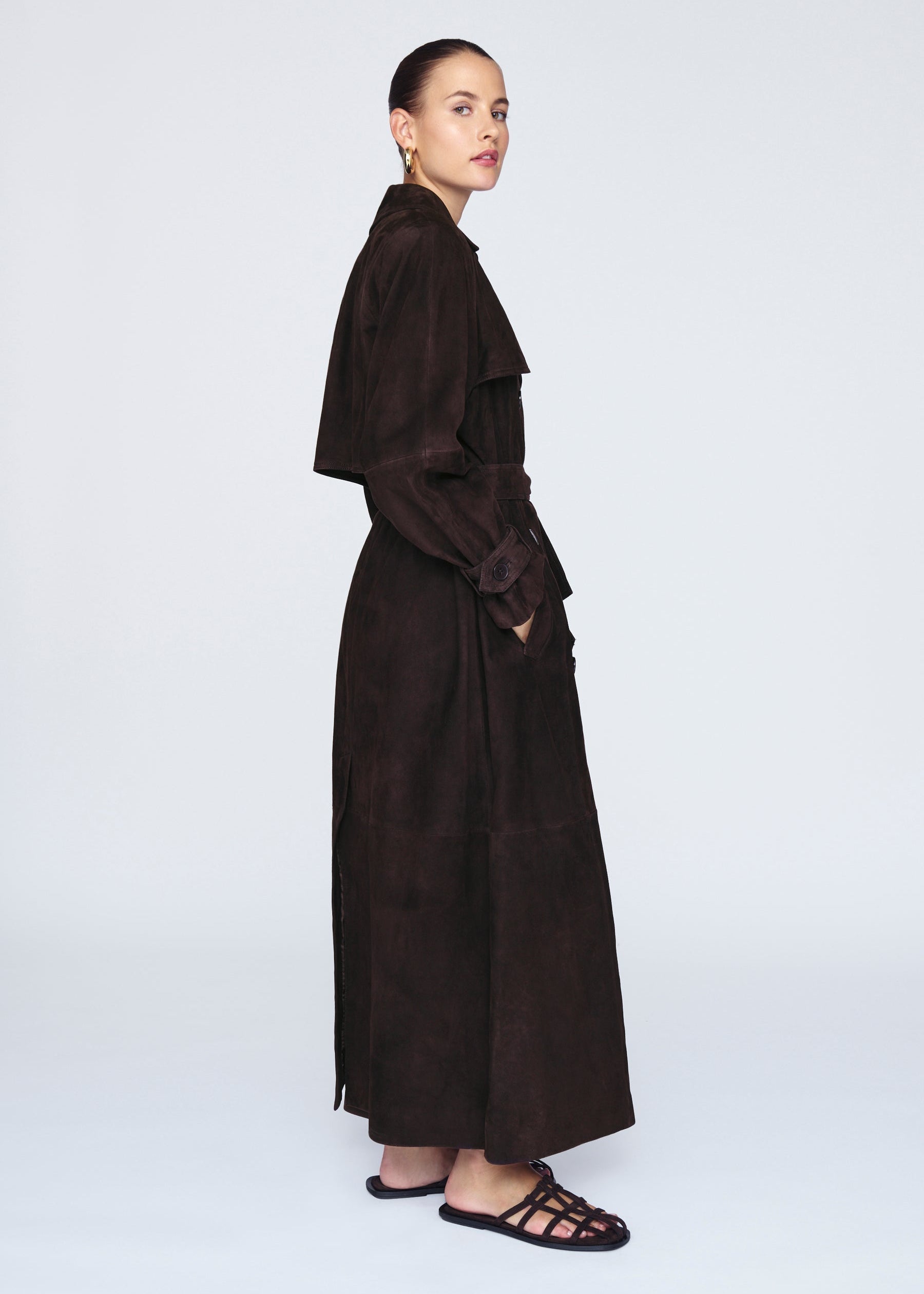 le Manteau Élégance Suédée allie raffinement et simplicité. Son design fluide et sa coupe longue mettent en valeur la silhouette avec un charme naturel et sophistiqué.